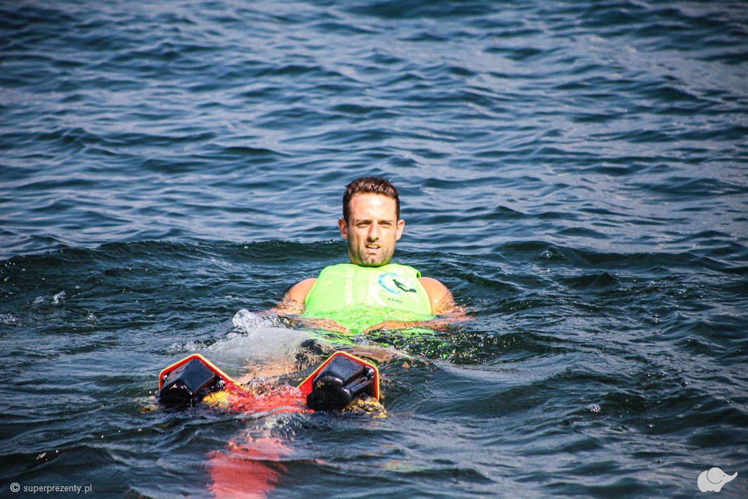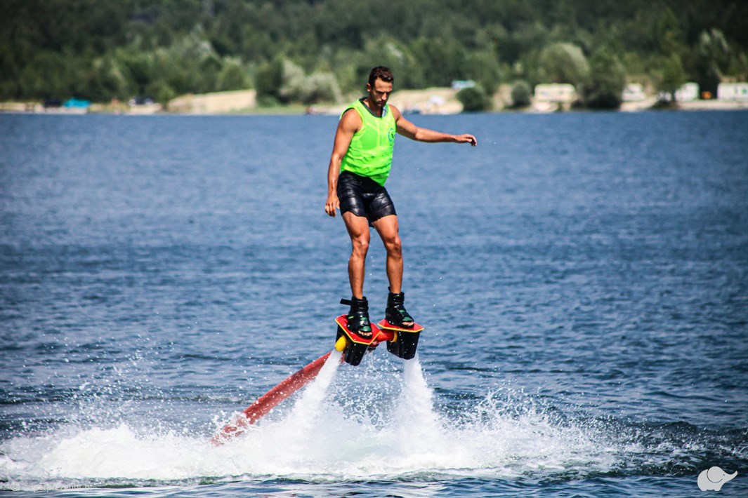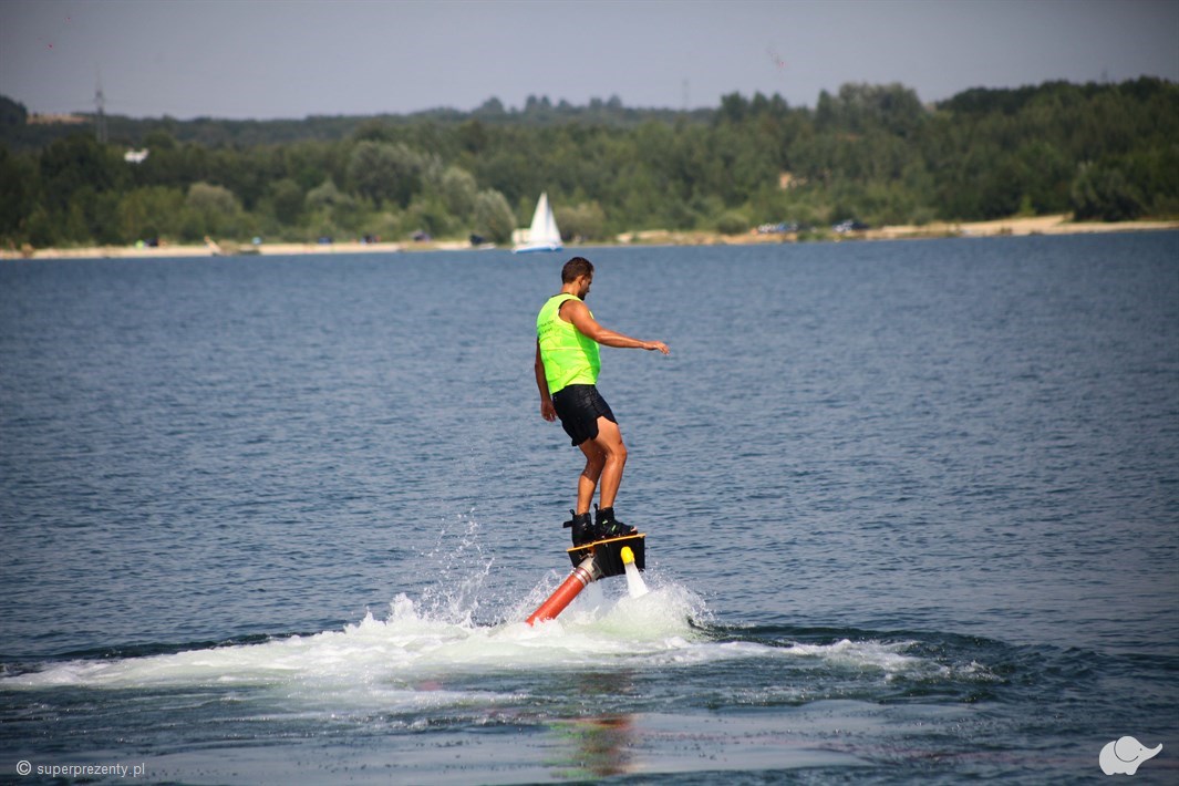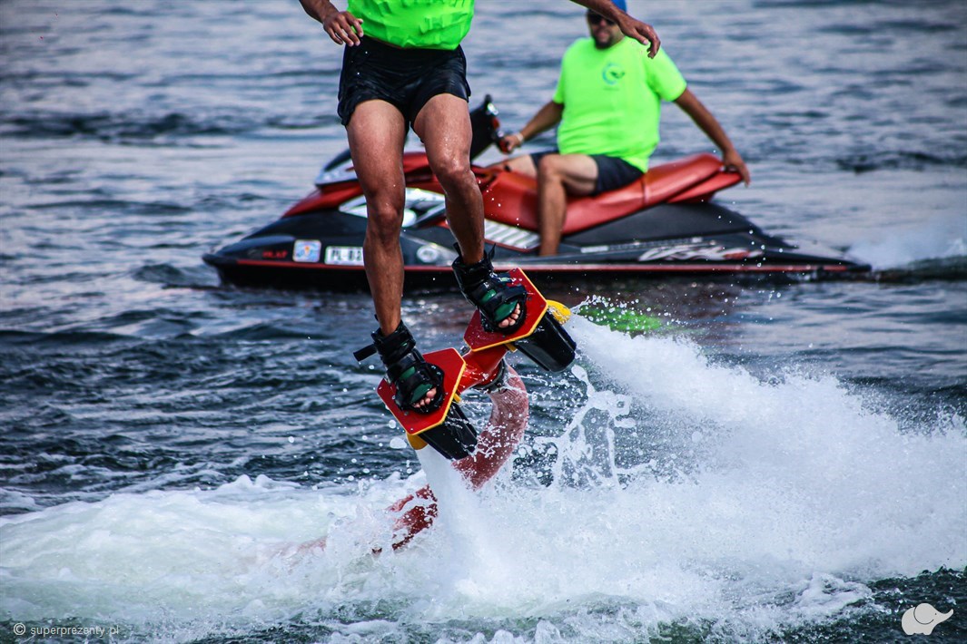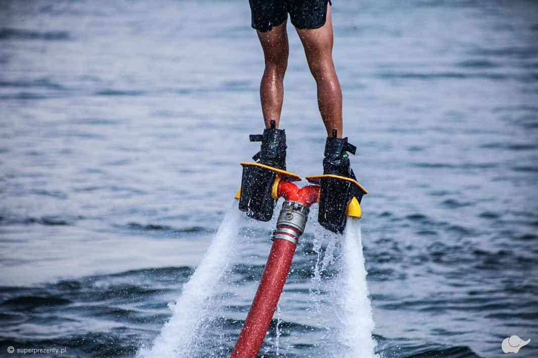 Pragniecie eksploracji niebios, ale ciężko zamówić bilet? Nie potrzebujecie drogiego samolotu, by wzbić się do góry – wystarczy odrobina wody oraz ludzkiej pomysłowości! Poznajcie znakomitą aktywność, dzięki której przerysujecie sny do rzeczywistości strumieniem wody, a dodatkowo skorzystacie z wakacyjnej aktywności w najbardziej oryginalnym stylu! FLYBOARD zasilany jest dzięki turbinie skutera wodnego, do którego jest podłączony specjalnie zaprojektowanym wężem. Taka instalacja umożliwia uniesienie się nad taflę wody aż do kilku metrów. Na urządzeniu można wykonywać różnorodne akrobacje - zarówno w wodzie, jak i w powietrzu. W ramach vouchera przysługuje Wam również nagranie przeżycia.