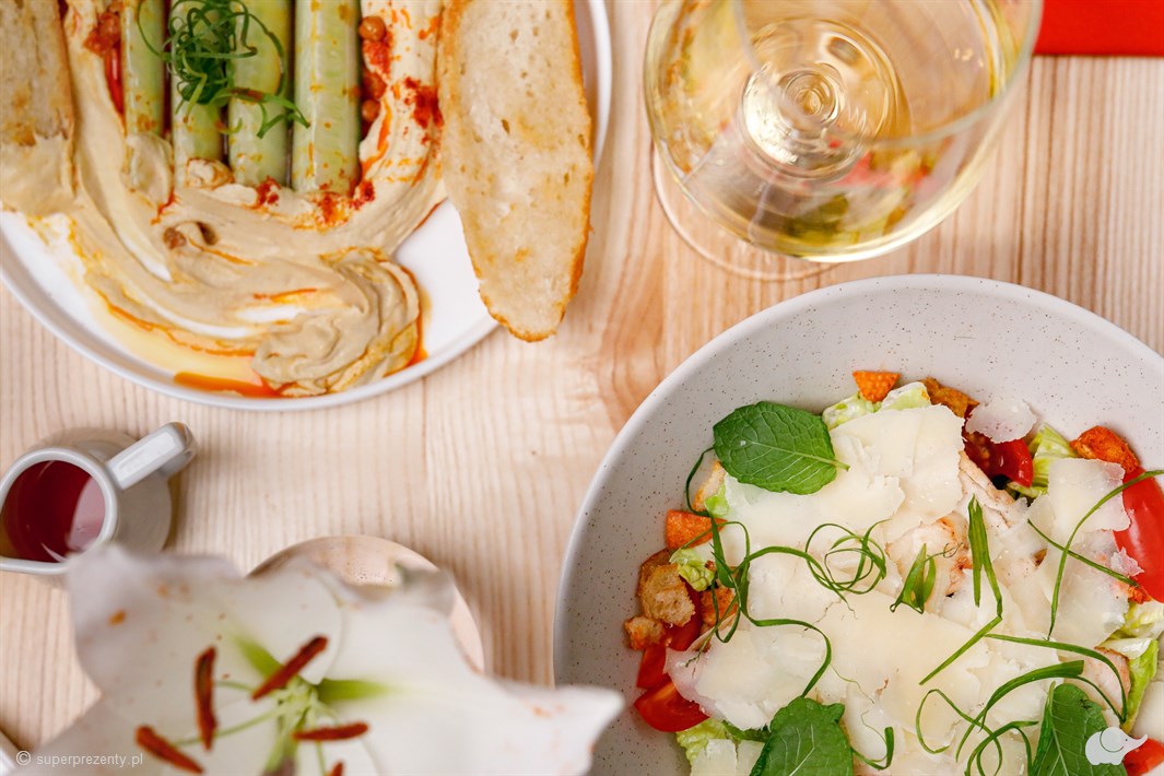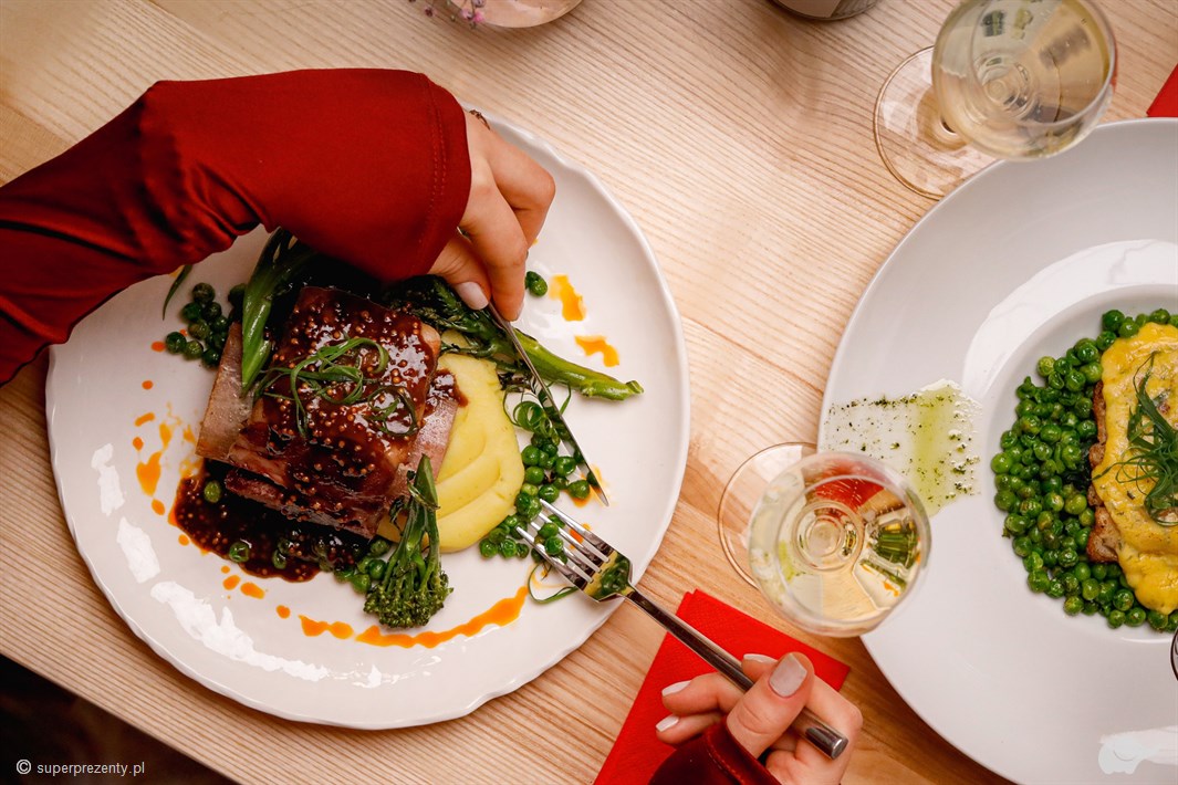 Można zacząć od delikatnego tatara z tuńczyka w akompaniamencie orzeźwiającego Rieslinga. Jako danie główne zachwyca kaczka sous vide z wiśniowym demi glace, idealnie komponująca się z kieliszkiem Primitivo, lub grillowany halibut z sosem berneńskim. Na słodki finał może zostać zaserwowane aksamitne tiramisu, które najlepiej smakuje w towarzystwie autorskiego Espresso Martini. Nic nie stoi na przeszkodzie, by kompozycję smaków, od przystawek po deser, dopełnić szerokim wyborem koktajli i win!