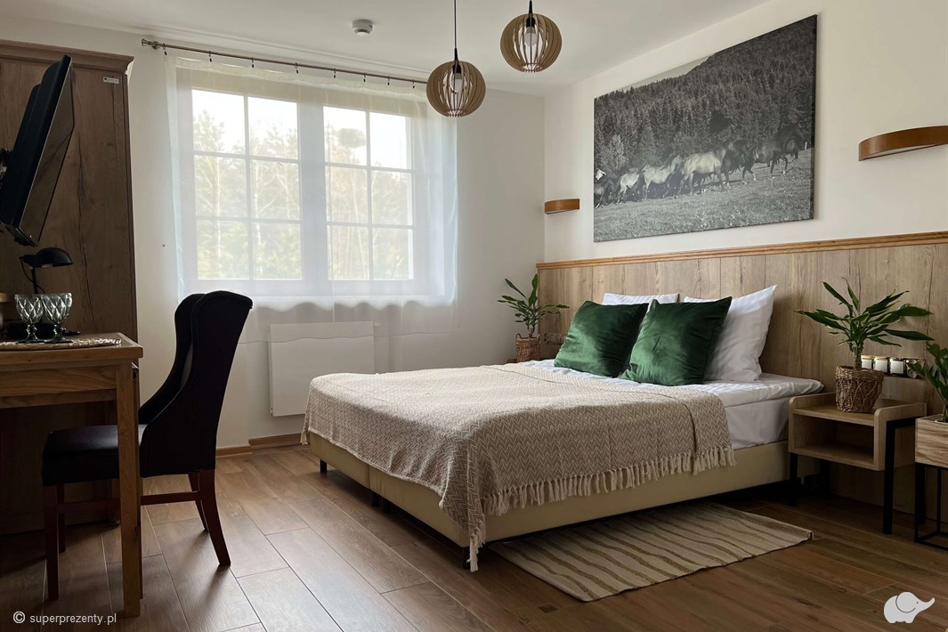 Voucher na pobyt dla dwojga w Beskidach gwarantuje luksusowy pobyt w górach w atmosferze komfortu i relaksu. W kompleksowo wyposażonym apartamencie z pięknym widokiem na góry lub ogród obdarowana para znajdzie przestronne łóżko, mini aneks kuchenny, lodówkę, przybory kuchenne, czajnik elektryczny, telewizor z płaskim ekranem. Odświeżą się w łazience z wanną lub prysznicem, mając pod ręką zestaw kosmetyków i komplet pachnących ręczników. Pobyt w Końskiej Dolinie to doskonała okazja do aktywnego wypoczynku – w okolicy bliska Ci para znajdziecie liczne szlaki turystyczne i rowerowe.