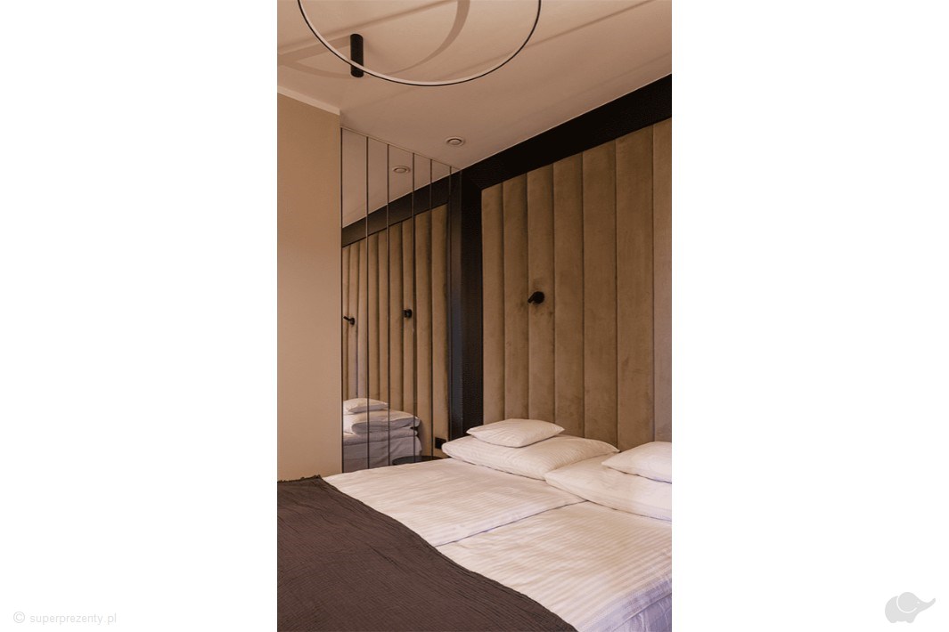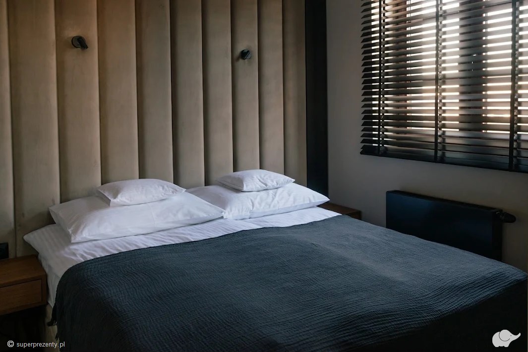 Po relaksującej sesji, na parę czekać będzie wspólna noc w nowoczesnym, klimatyzowanym apartamencie w Wodnej Wieży. Apartament o powierzchni 34m2 wyposażony jest w komfortową sypialnię z łóżkiem małżeńskim, przestronny salon z widokiem na panoramę Pszczyny, wygodną sofę, telewizor z dostępem do wielu kanałów oraz komfortowe miejsce do pracy. W dużej łazience znajdują się również zestawy z naturalnymi kosmetykami, a dodatkowe udogodnienia, takie jak ekspres do kawy, czajnik, bezpłatny dostęp do WI-FI i eleganckie szlafroki, zapewnią pełen komfort oraz relaks.