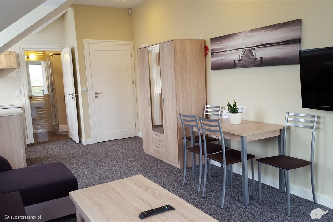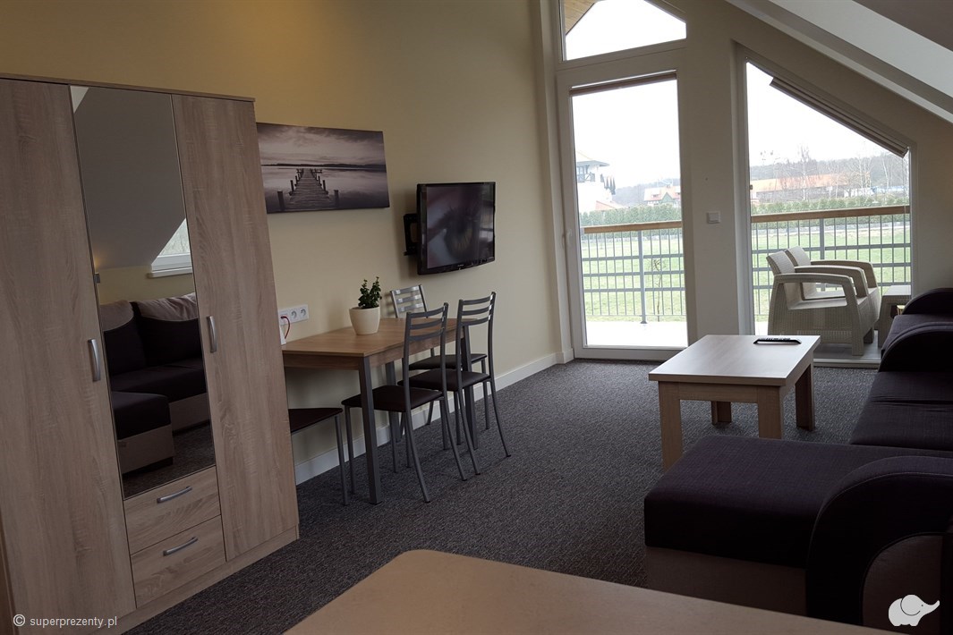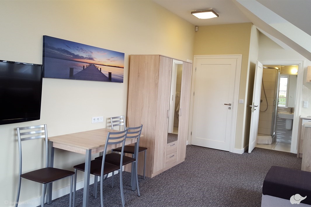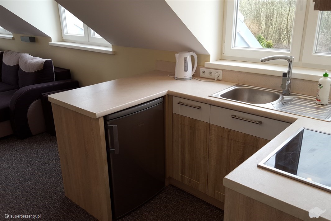Przestronny apartament dla dwóch osób wyposażony został w aneks kuchenny z lodówką i płytą grzejną. Do swojej dyspozycji macie również przestronną łazienkę z suszarką do włosów. W apartamencie skorzystacie także z szybkiego Internetu LTE. To idealne warunki, aby po aktywnym wypoczynku w malowniczej scenerii, zrelaksować się przy herbacie lub innym trunku, podziwiając z balkonu panoramę na jezioro Roś.