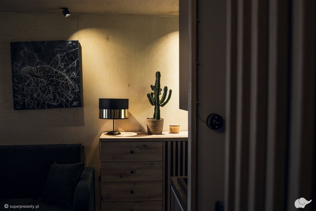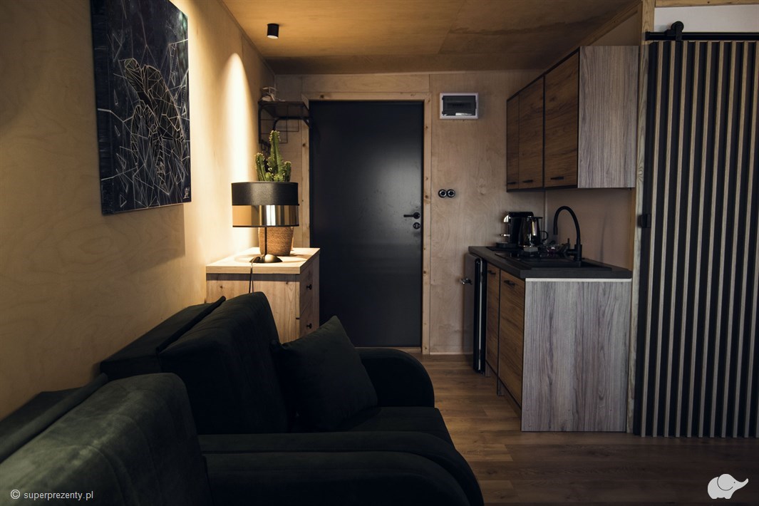 Domek, przeznaczony dla dwóch osób, zapewnia wszystko, co potrzebne do wygodnego wypoczynku – aneks kuchenny, łazienkę oraz dwa tarasy, z których można podziwiać malownicze wschody i zachody słońca. Co więcej, na dole czeka prywatna balia opalana drewnem, idealna na wieczorny relaks (za dodatkową opłatą). To wyjątkowy prezent dla kogoś, kto marzy o chwili ciszy i spokoju z dala od miejskiego zgiełku.