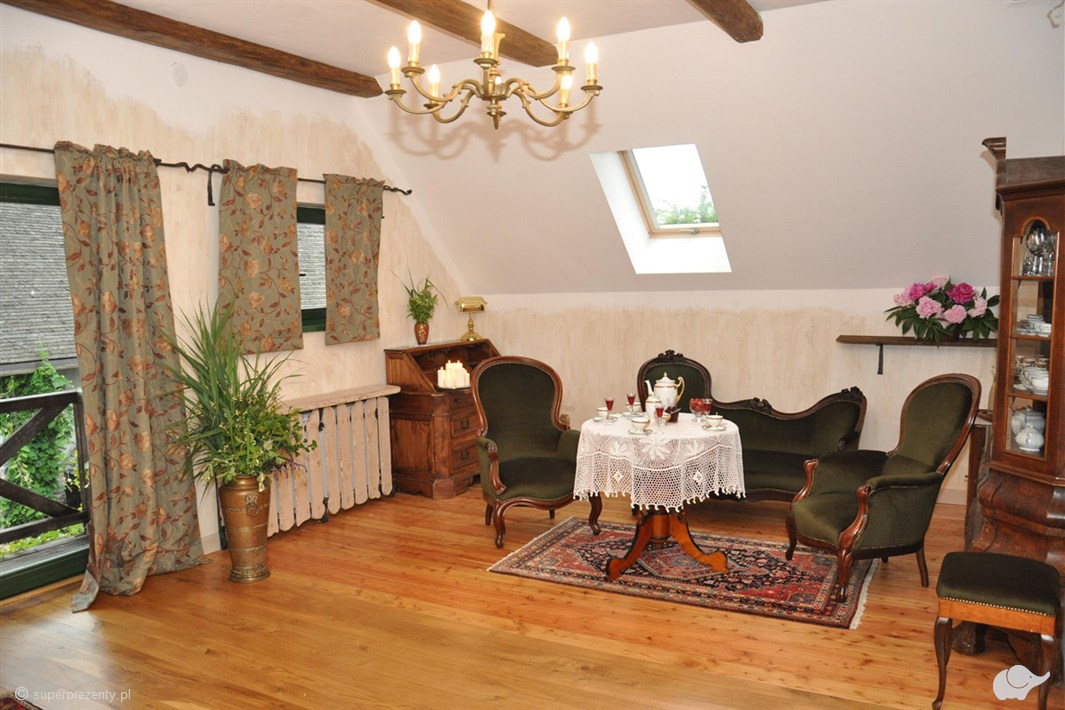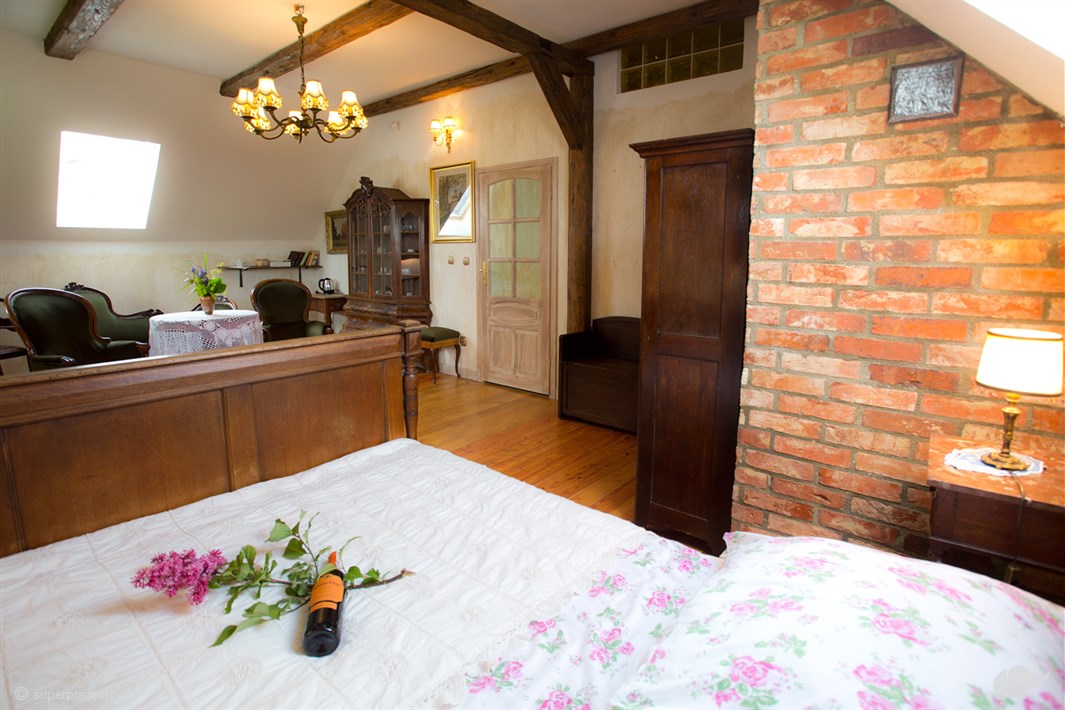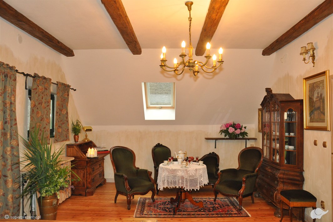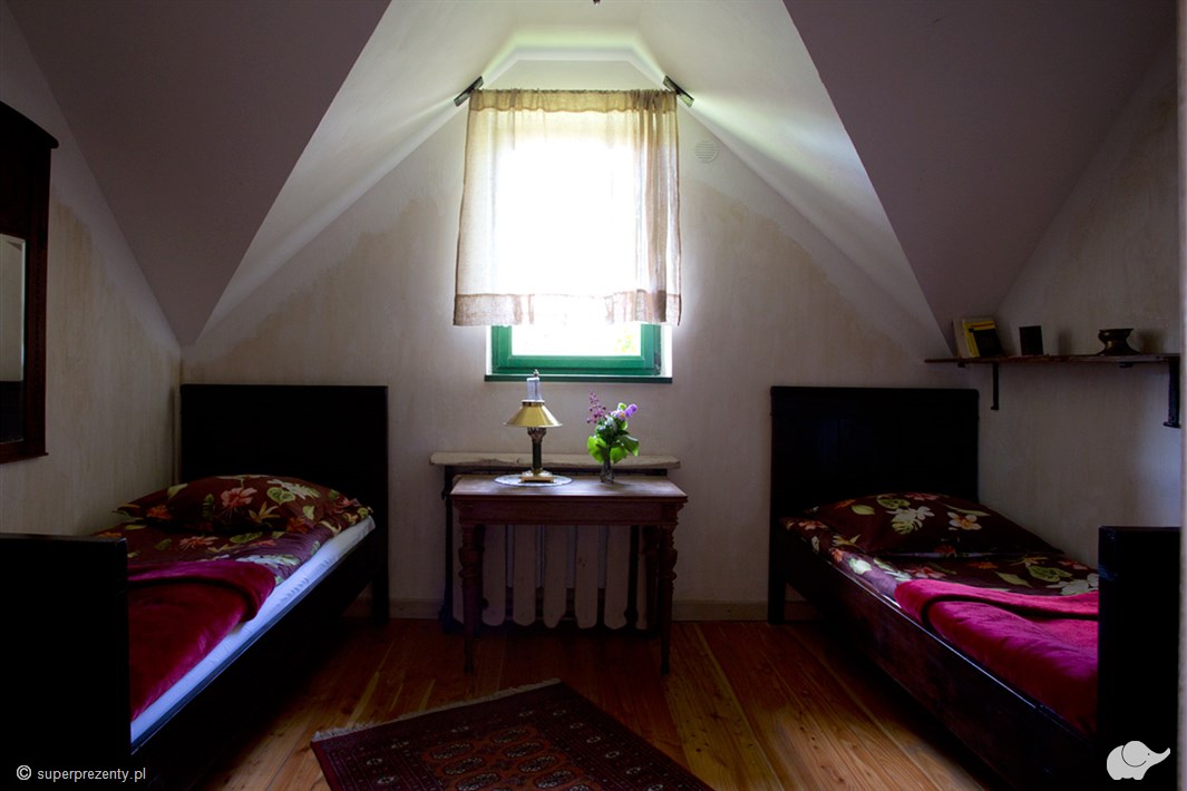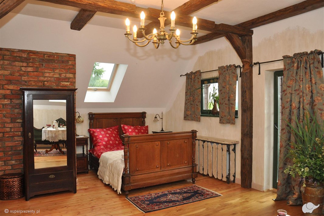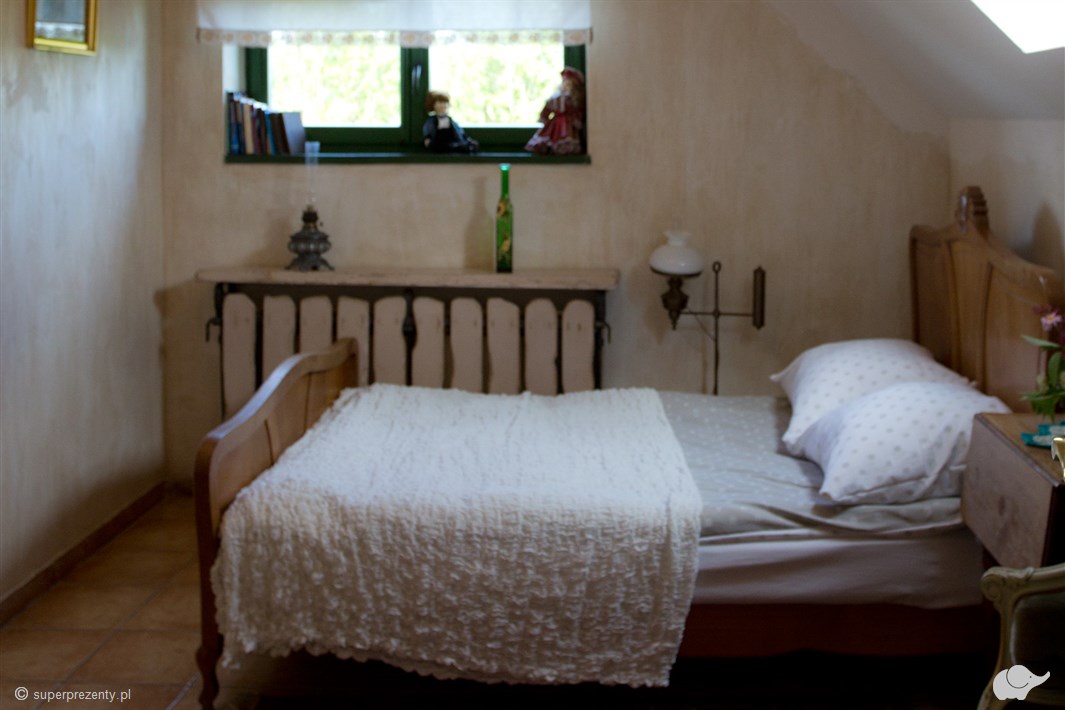 W pokoju znajdują się oryginalne meble – stare szafy, lampy, bibeloty i książki. Komfortowa łazienka będzie spełnieniem marzeń par, które pragną wyciszenia i relaksu podczas wspólnej kąpieli. Dom Kameralny zapewni Wam wszystko, czego potrzebujecie. Znajdziecie tutaj spokój, intymność i zasłużony relaks tylko we dwoje.