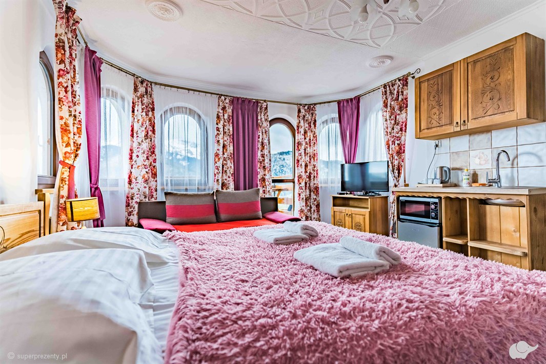 Tutaj odetchniecie rześkim górskim powietrzem. Po wyjściu na balkon zachwyci Was majestatyczna panorama Tatr. Czy dostrzeżecie wybijający się na jej tle Giewont? Kościelisko, nazywane „Sercem Podhala”, prócz zapierających dech widoków oddaje gościom coś jeszcze cennego – ciszę, której próżno szukać w centrum kurortów. Romantyczny weekend w górach to doskonała okazja, by uciec od zgiełku miasta i nacieszyć się bliskością natury. A Górski Pałacyk w stylu podhalańskim z nowocześnie zaaranżowanymi wnętrzami jest do tego wręcz stworzony. Do tego zamieni się w Waszą bazę wypadową zarówno na zimowe szaleństwo na stoku, jak i letnie wędrówki malowniczymi szlakami!