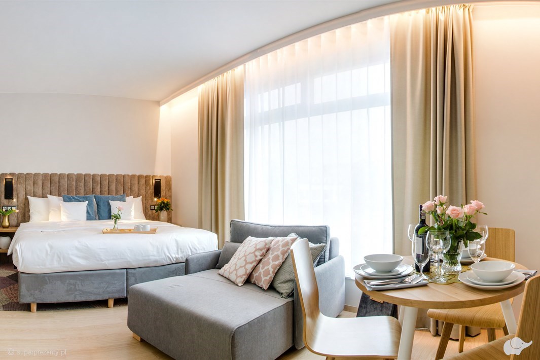 Ekskluzywny apartament z dużym łóżkiem typu king-size oraz dodatkowym, wygodnym szezlongiem. Przeznaczony jest dla 1, 2 oraz 3 osób. Dodatkowo w apartamencie znajduje się bardzo dobrze wyposażony aneks kuchenny oraz cześć jadalniana. Całości dopełnia prywatna łazienka z prysznicem.