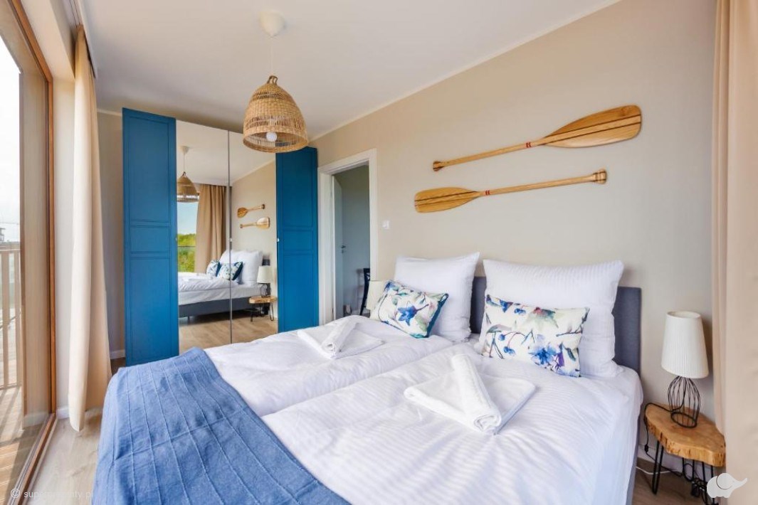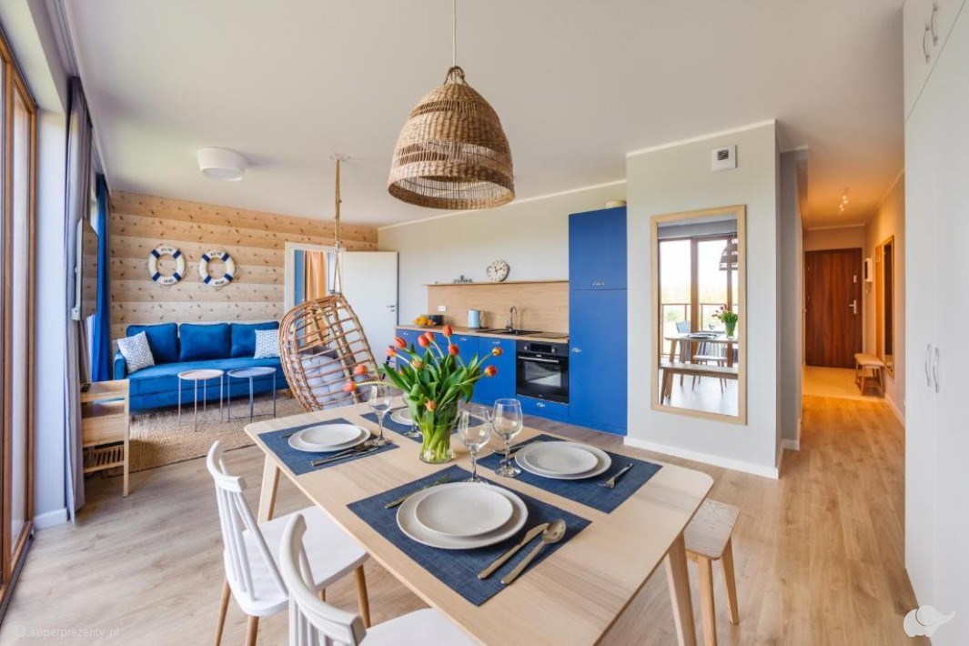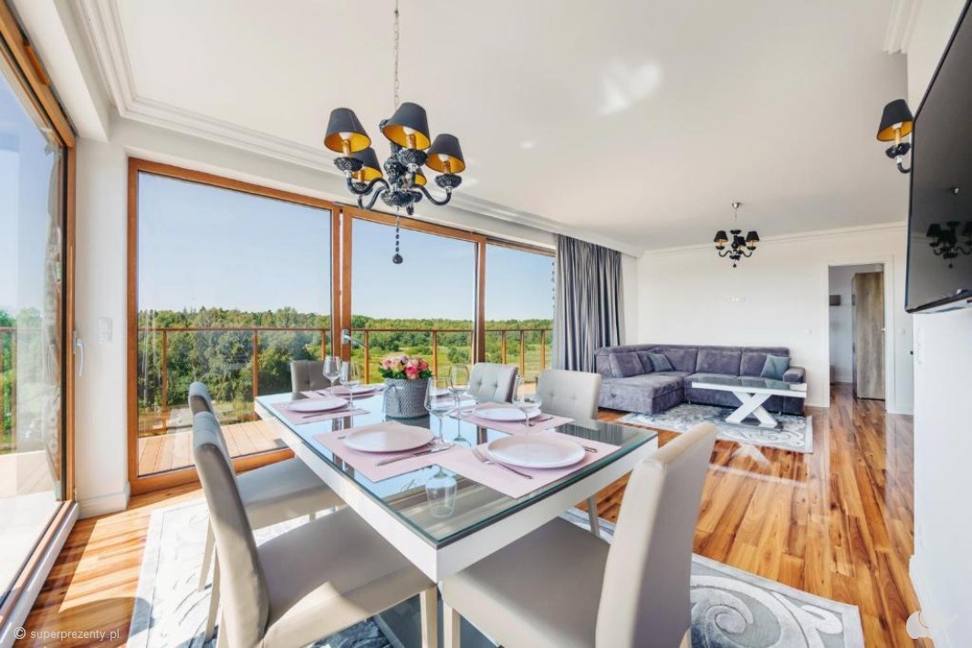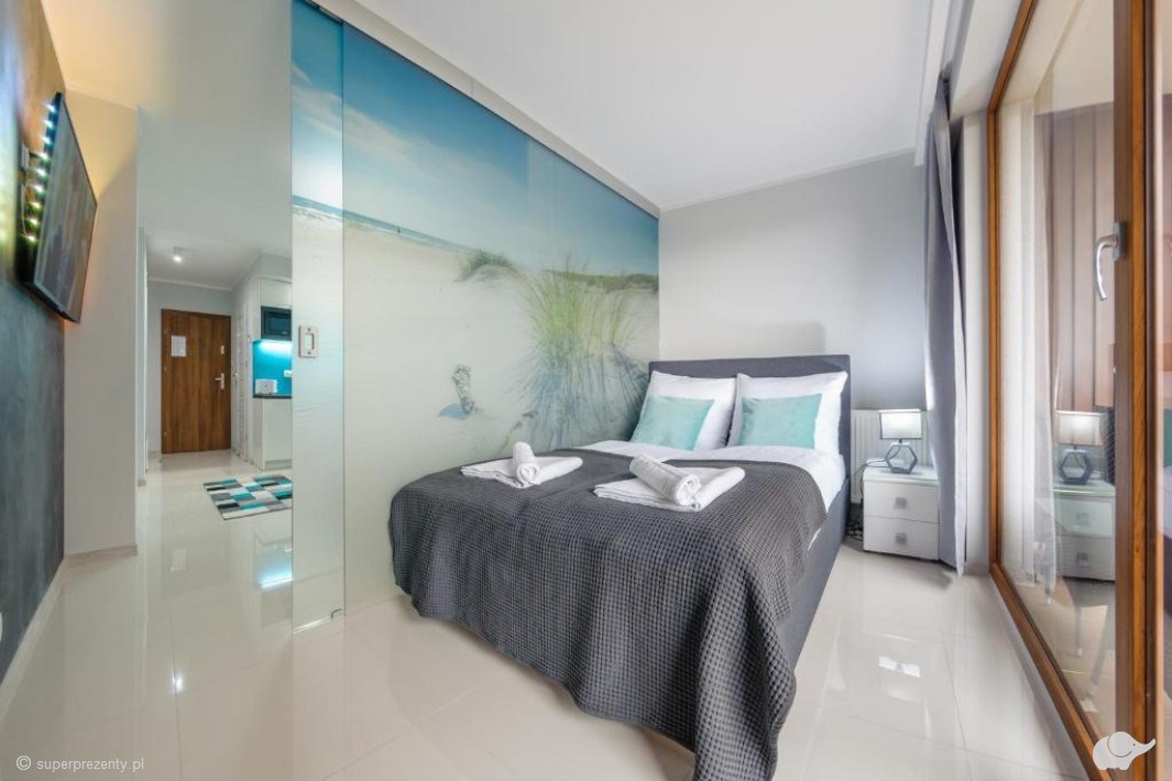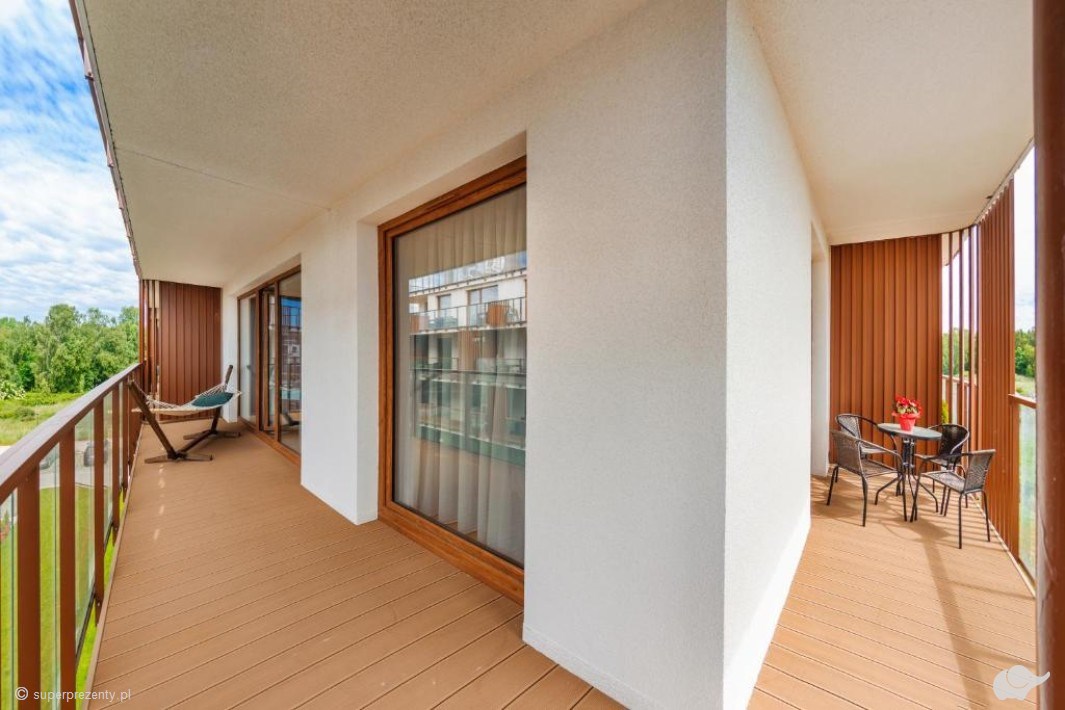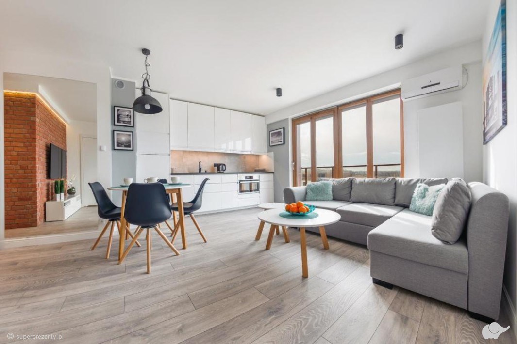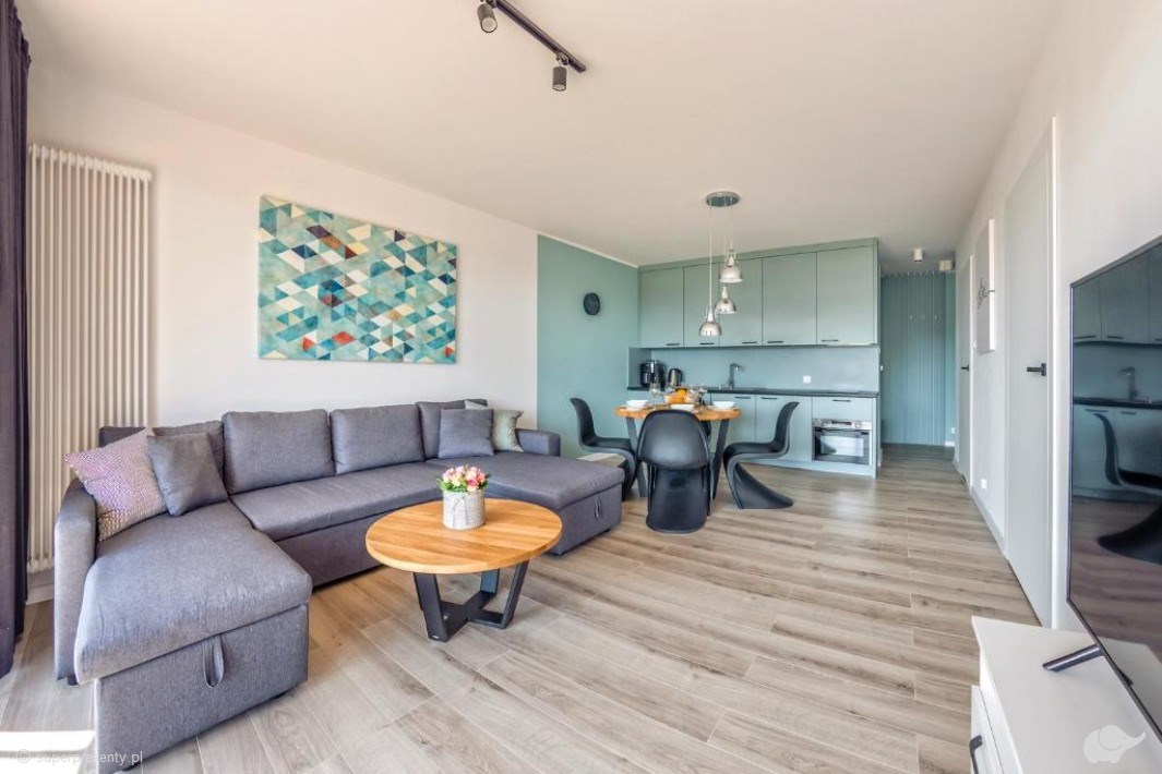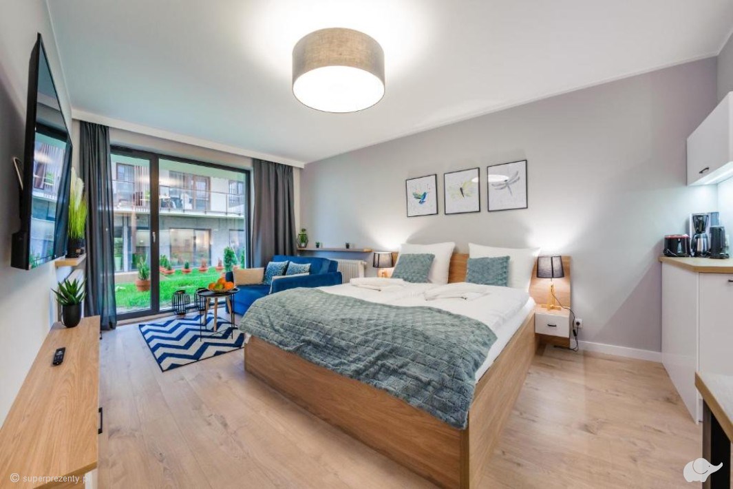 Apartament, w którym spędzicie czas, posiada wysoki standard, odpowiednio dobraną kolorystykę, funkcjonalny, w pełni wyposażony aneks kuchenny oraz przestronny taras z widokiem na dziedziniec lub na park należący do obszaru Natura 2000.