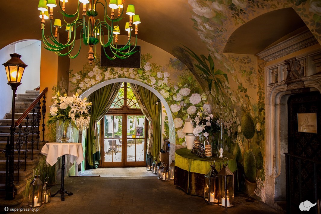 Trattoria La Campana znajduje się w zabytkowej kamienicy o bogatej historii oraz niepowtarzalnych walorach widokowych. Podczas spożywania wykwintnego posiłku zauroczy Was zieleń rozpieszczająca źrenice. Jest ona widoczna już z okien lokalu, a bezpośrednią styczność z tak niecodziennymi okolicznościami kolacji uzyskacie po przejściu do przepięknego zewnętrznego ogródka.