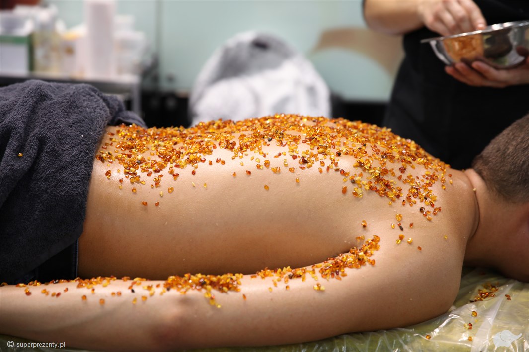 Ten ekskluzywny zabieg to połączenie peelingu bursztynowego całego ciała z relaksującym masażem pleców, który sprawi, że skóra stanie się jedwabiście gładka i odżywiona. Rytuał bursztynowy skutecznie złuszcza martwy naskórek, poprawia mikrokrążenie i dotlenia skórę. Ekstrakt z bursztynu działa jak naturalny eliksir młodości, poprawiając elastyczność skóry, wygładzając ją oraz chroniąc przed fotostarzeniem. Stymuluje produkcję kolagenu i kwasu hialuronowego, dzięki czemu skóra staje się jędrna i promienna.