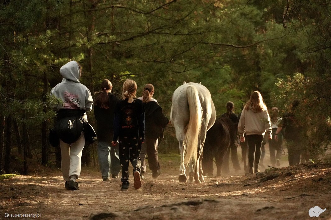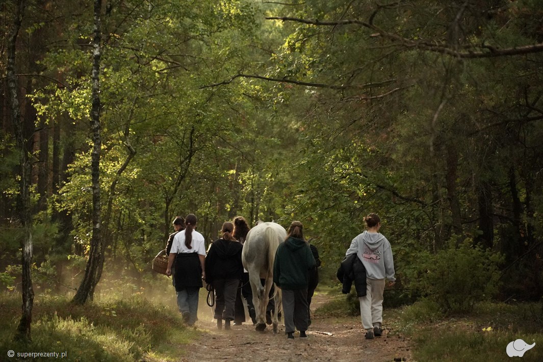 Spokojny spacer z końmi po lesie to skuteczna forma medytacji w ruchu! Konie mają niezwykłą zdolność wyczuwania emocji, co pomaga skupić się na tym, co tu i teraz. Półtora lub dwu i półgodzinne doświadczenie w Osadzie Przygoda pod Warszawą pozwala wyciszyć się i złapać oddech. W rytmie końskich kroków i szelestu liści, bez pośpiechu i oczekiwań, poczujecie bliskość natury i wyciszenie, które jest bezcenne. Nie trzeba mieć doświadczenia – wystarczy otwartość na ten unikalny relaks z końmi. Gwarantujemy, że kontakt z przyjaźnie usposobionymi zwierzętami doskonale poprawi Wam humor!
