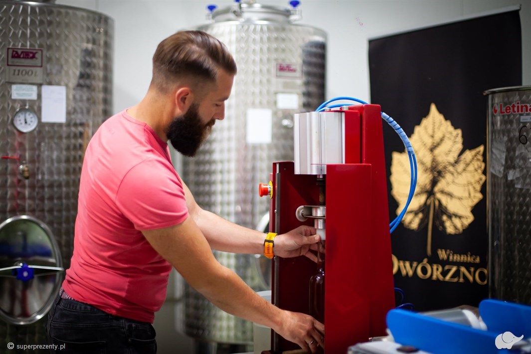 Pierwszą częścią realizacji prezentu jest zwiedzanie wytwórni win oraz poznanie wykorzystywanego w niej sprzętu i jego zastosowań. Poznacie szczegółowo kulisy produkcji win tradycyjnymi, naturalnymi metodami. Następnie będziecie aktywnie uczestniczyli w procesie produkcyjnym. Pokażemy Wam jak próbować wina i kontrolować jego jakość w zbiornikach, zbadamy parametry wina i porównamy wyniki. Ostatnim etapem będzie własnoręczne nalanie win do butelek, zakorkowanie ich i oklejenie własnymi, personalizowanymi etykietami, z nadaną przez siebie nazwą wina. Każdy uczestnik otrzyma 3 pzygotowane przez siebie butelki. Wina będą wspaniałą pamiątką tego niecodziennego przeżycia.