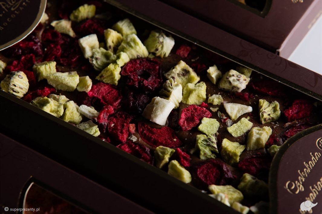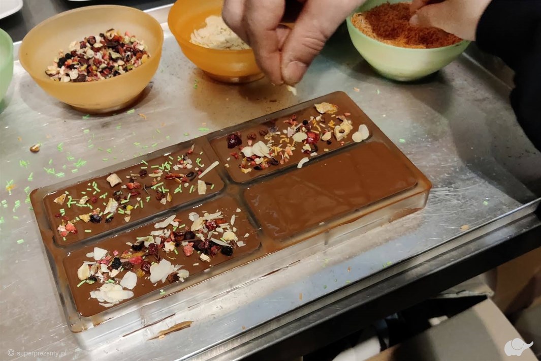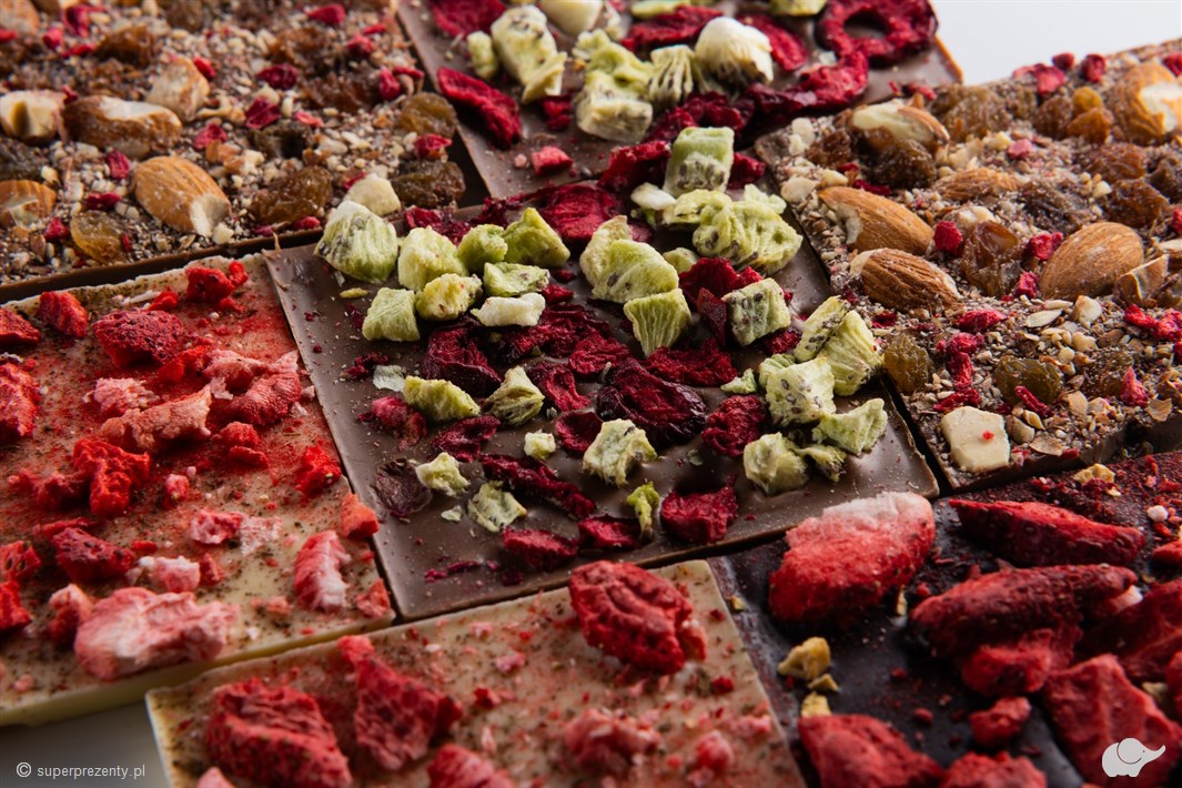 Osoba obdarowana wybierze wzór, dekorację oraz bazę czekolady, którą pragnie stworzyć. Oprócz tego istnieje możliwość doboru aż 5 dowolnych dodatków!