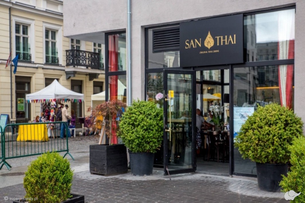 San Thai to warszawska restauracja stworzona przez matkę i syna zakochanych w kuchni tajskiej. Pragnąc klimatu oraz niecodziennych połączeń smakowych, z których słynie kuchnia azjatycka, założyciele tego miejsca stworzyli lokal, w którym przykłada się uwagę nawet do drobnych szczegółów, a wszystko po to, by jak najwierniej odzwierciedlić kunszt najlepszych tajskich potraw. Na uwagę zasługuje również talent tutejszych kucharzy, doświadczonych dzięki latom doświadczeń i zawdzięczającym swoją merytorykę styczności z kuchniami całego świata. Voucher do restauracji San Thai to przede wszystkim wspaniała, kulinarna podróż po perfekcji serwowanej w tajskich klimatach.