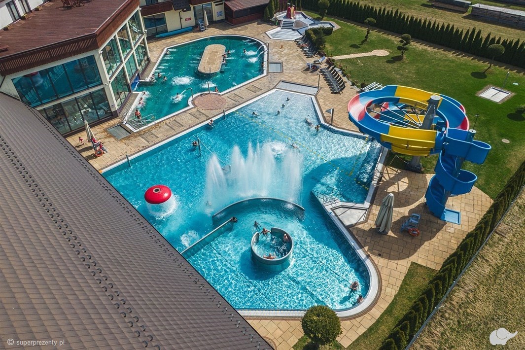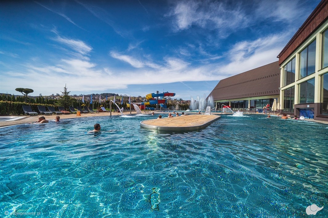 Termy Szaflary to wyjątkowe miejsce rekreacji i wypoczynku z basenami termalnymi i komfortowymi apartamentami. Oferują relaks na najwyższym poziomie. Baseny wypełniono ciepłą wodą termalną o temperaturze 30°C -38°C, a sam kompleks posiada liczne urządzenia do hydromasażu, takie jak bicze wodne, ławki do masażu, jeżyki i gejzery. Baseny są dostosowane do potrzeb zarówno najmłodszych, dzięki brodzikowi z zjeżdżalnią Słonikiem, jak i tych chcących zażyć szalonej zabawy na zjeżdżalniach o różnej długości nawet do 55 metrów. W okresie letnim na użytkowników czeka także basen z Aqua zorbingiem i łódeczkami. Termy Szaflary to idealne miejsce nie tylko wypoczynek, ale i regenerację organizmu. Znajdujące się w wodzie składniki mineralne, takie jak potas, sód, magnez, wapń, żelazo i siarka przekładają się na liczne korzyści zdrowotne – redukcję otyłości, eliminację bezsenności, stabilizację tętna, poprawę kondycji układu krążenia, czy redukcję bólu głowy i stresu. Spędźcie relaksujący pobyt w Termach Szaflary, gdzie komfort i przyjemność są na pierwszym miejscu.