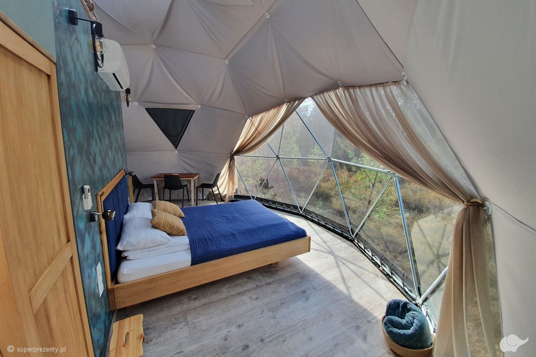 W namiocie mieści się z kolei przestronna słoneczna sypialnia z widokiem na las, w pełni użytkowa kuchnia, stół z krzesłami oraz duża wygodna łazienka z prysznicem. Nad głównym łóżkiem znajduje się także antresola, z której można podziwiać gwiazdy przez świetlik dachowy. Dodatkowo, do namiotu przynależą dwa tarasy, z czego na frontowym znajdują się meble ogrodowe i grill, a na drugim gorąca bania.