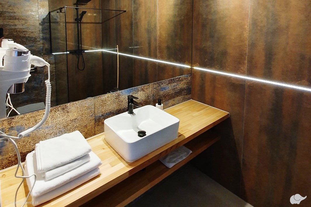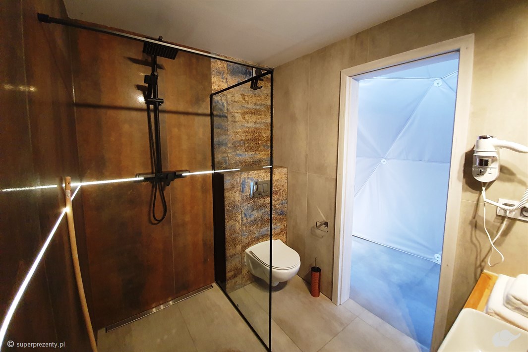 W namiocie mieści się z kolei przestronna słoneczna sypialnia z widokiem na las, w pełni użytkowa kuchnia, stół z krzesłami oraz duża wygodna łazienka z prysznicem. Nad głównym łóżkiem znajduje się także antresola, z której można podziwiać gwiazdy przez świetlik dachowy. Dodatkowo, do namiotu przynależą dwa tarasy, z czego na frontowym znajdują się meble ogrodowe i grill, a na drugim gorąca bania.