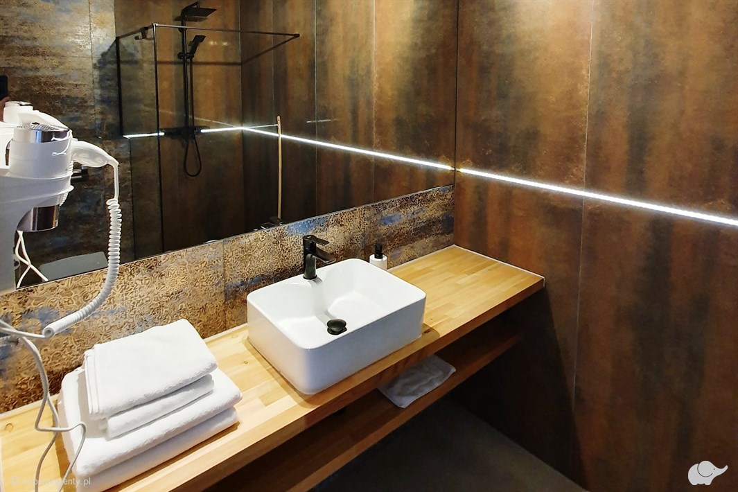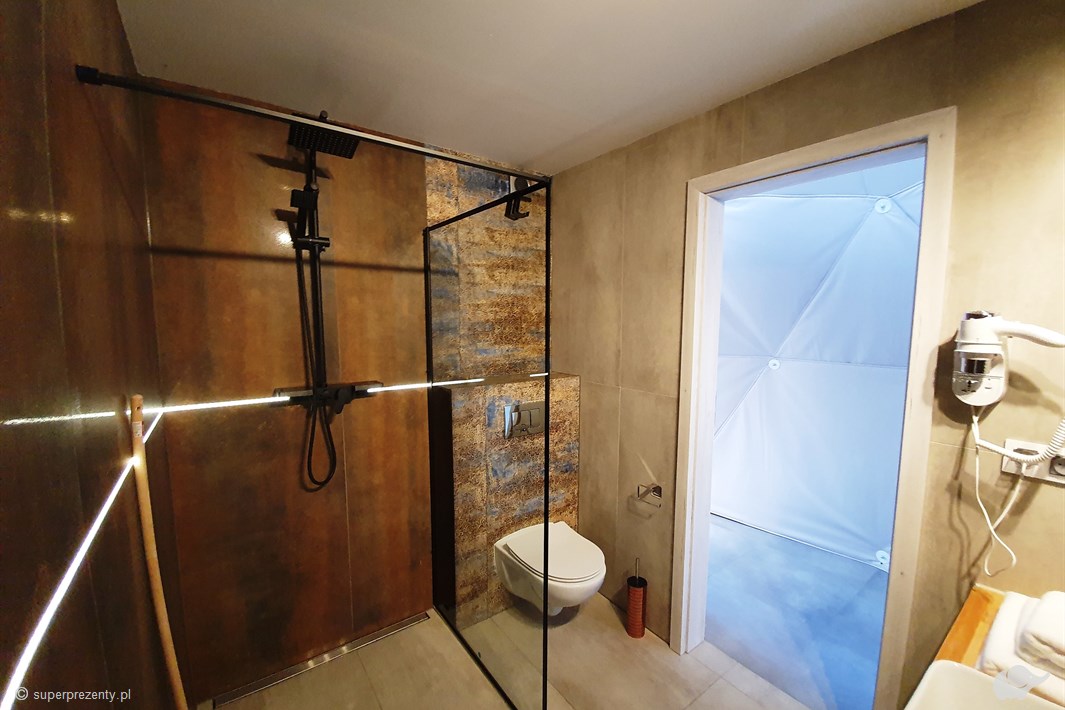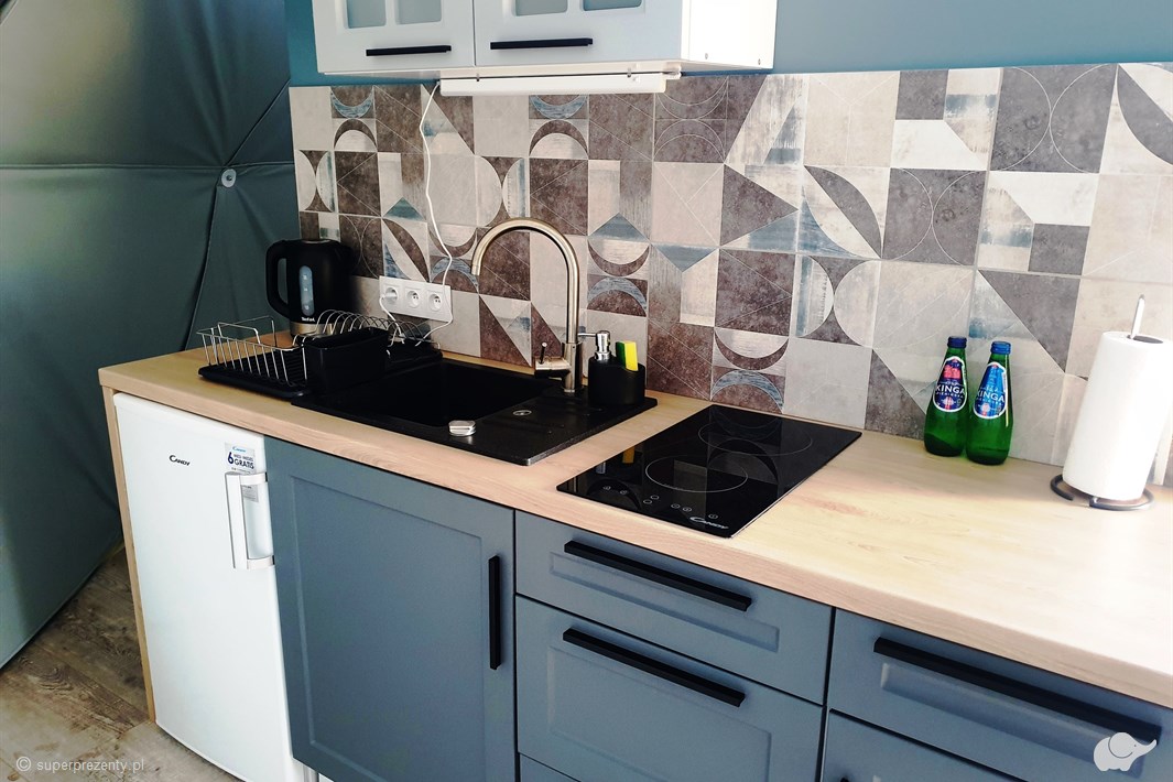 W namiocie mieści się z kolei przestronna słoneczna sypialnia z widokiem na las, w pełni użytkowa kuchnia, stół z krzesłami oraz duża wygodna łazienka z prysznicem. Nad głównym łóżkiem znajduje się także antresola, z której można podziwiać gwiazdy przez świetlik dachowy. Dodatkowo, do namiotu przynależy słoneczny taras z meblami ogrodowymi oraz grillem.