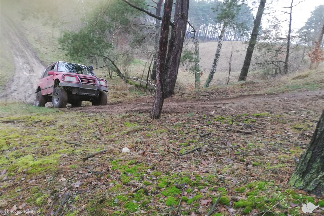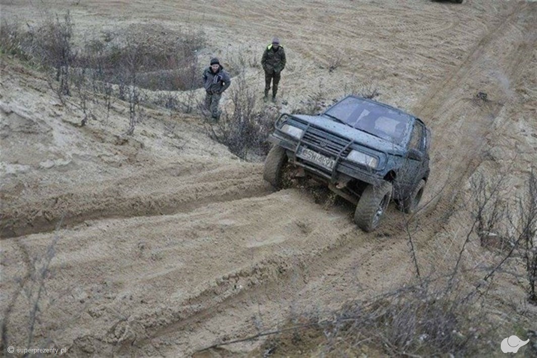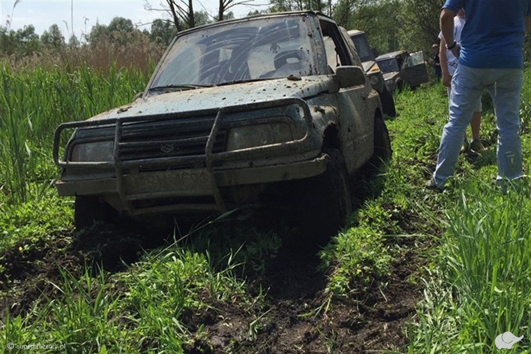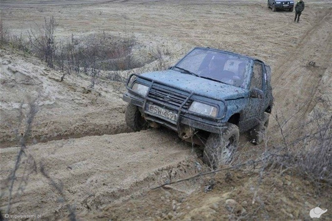 Realizacja samochodem terenowym Suzuki Vitara. Samochód specjalistycznie przygotowany do off-rodu i wyposażony w niezbędny sprzęt.