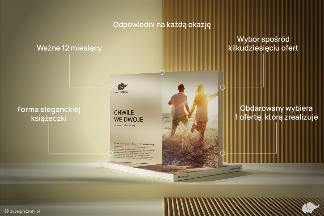 Zestaw prezentowy „Chwile we Dwoje” to ponad 50 atrakcji w całej Polsce, przygotowanych z myślą o parach. Znajdziecie w nim propozycje pełne relaksu – masaże, pobyty w spa i klimatyczne wyjazdy, kulinarne degustacje smaków świata, a także dawkę adrenaliny: jazdę monster truckiem, strzelanie czy malownicze rejsy. To elastyczny prezent – obdarowani sami wybierają przeżycie, które najbardziej ich ucieszy. Jedno jest pewne: czeka ich czas pełen emocji i wspólnych wrażeń!