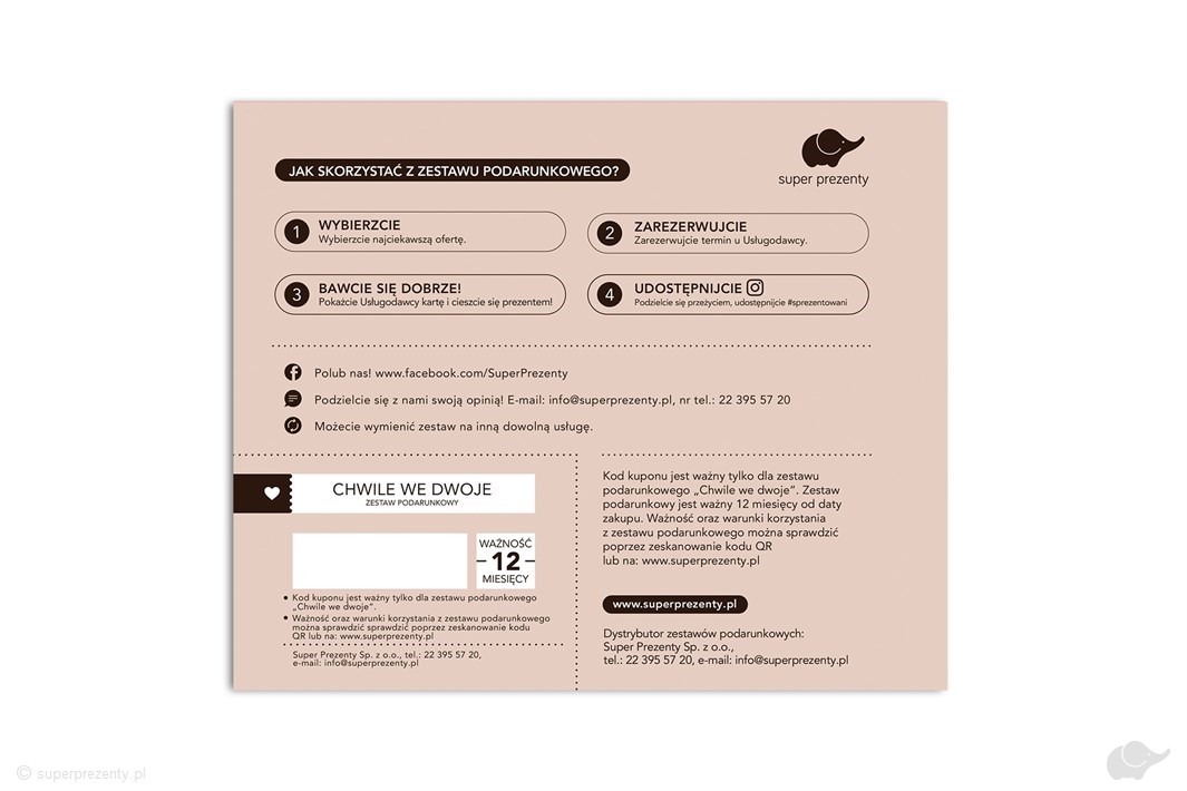 Każda para ma swoje rytuały – ulubioną kawiarnię, film czy piosenkę. Ale są też chwile, które wyrywają z codzienności i zostają w pamięci na zawsze. Właśnie takie emocje czekają w zestawie „Chwile we Dwoje” – od romantycznych kolacji i relaksujących masaży, przez degustacje win i inspirujące podróże, aż po ekstremalne przygody, jak off-road czy loty w przestworzach. To zaproszenie do wspólnych przeżyć, które tworzą najpiękniejsze wspomnienia.