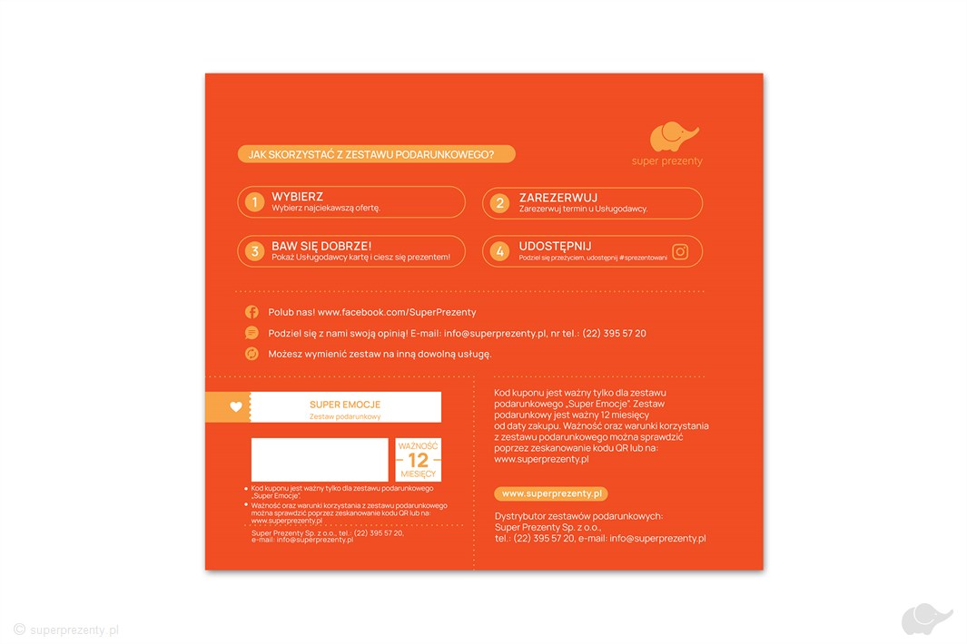 Odbiorca zestawu podarunkowego „Super Emocje” wybierze jedno z przeżyć zawartych w katalogu. Każda z ofert zawiera opis przedstawiający szczegóły przeżycia, a ponadto informacje o rezerwacji i wymaganiach do realizacji.