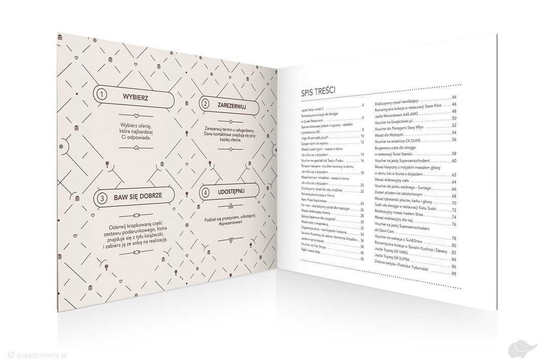 Zestaw Podarunkowy to ponad trzydzieści osiem propozycji zebranych w jednym katalogu. To najlepsza opcja prezentowa, jeżeli chcesz dać komuś możliwość wyboru wymarzonego przeżycia!