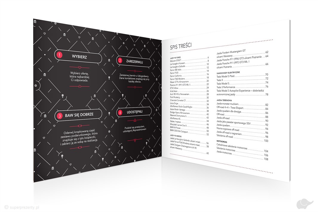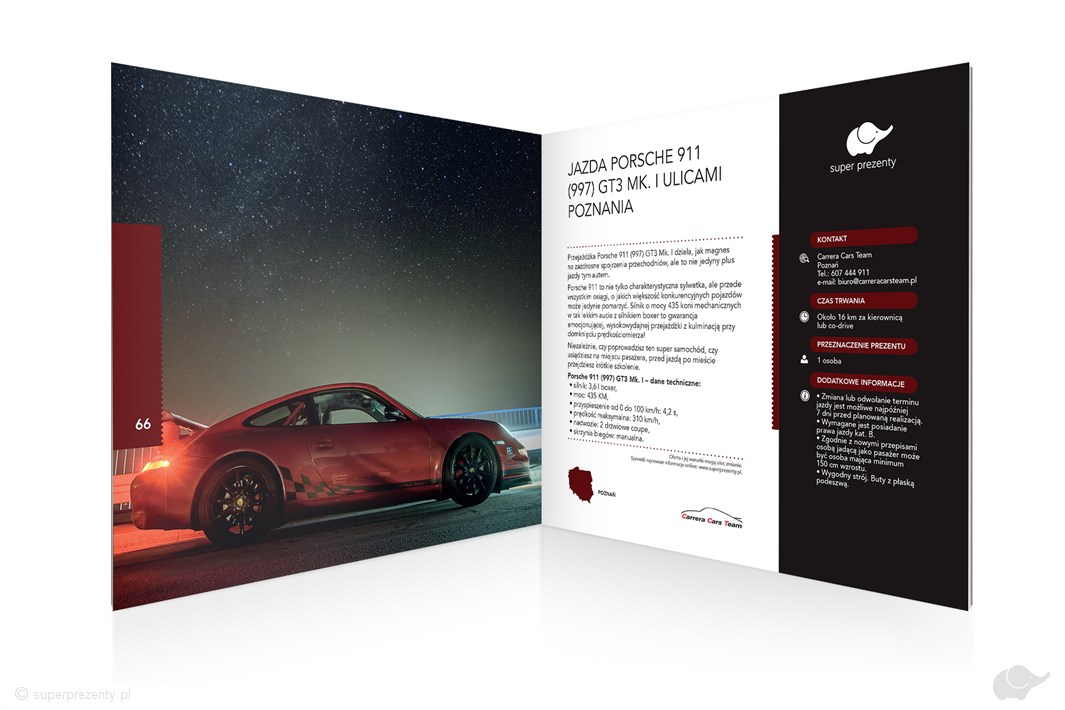 Zestaw jest idealnym rozwiązaniem, gdy nie jesteśmy pewni preferencji obdarowanego. Bogata oprawa wizualna katalogu i różnorodność przeżyć sprawiają, że prezent staje się niezapomnianym doświadczeniem dla każdego miłośnika i miłośniczki motoryzacji! A osoba obdarowana wybierze przeżycie, które najbardziej jej odpowiada – na torze lub ulicach miasta.