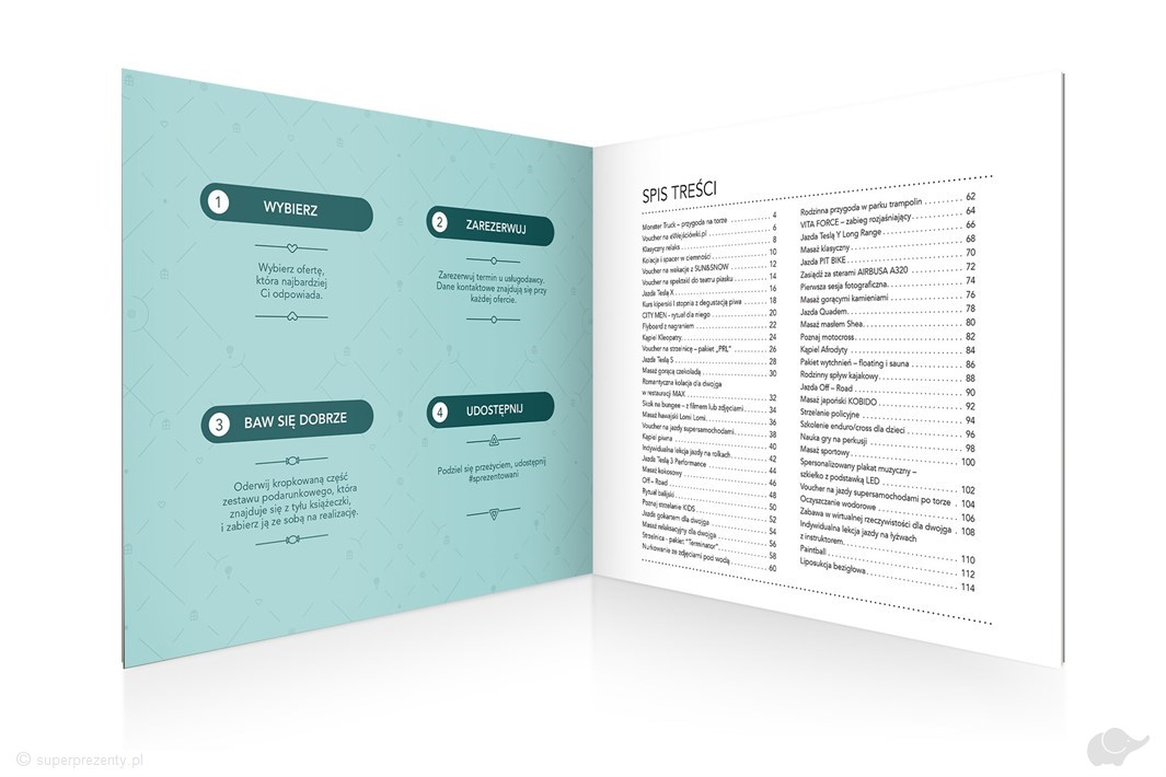 Osoba obdarowana wybierze jedno z przeżyć zawartych w książeczce. Każda z ofert zawiera opis przedstawiający szczegóły przeżycia, a ponadto informacje o rezerwacji i wymaganiach do realizacji.