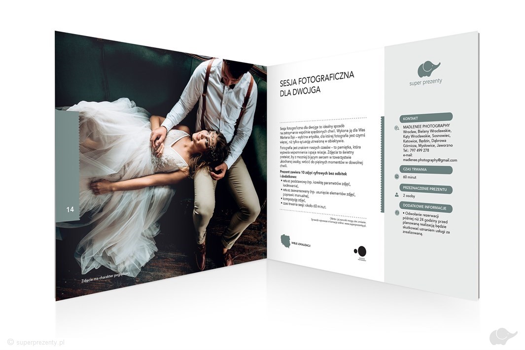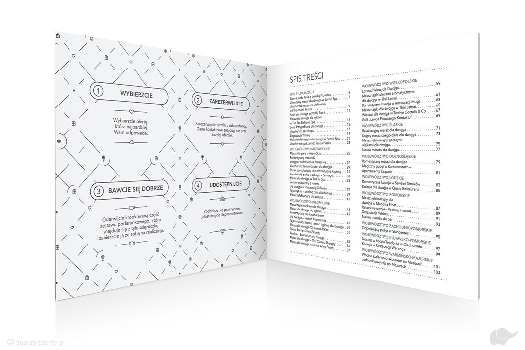 Obdarowana przez Ciebie para wybierze jedno z przeżyć zawartych w książeczce. Każda z ofert zawiera opis przedstawiający szczegóły przeżycia, a ponadto informacje o rezerwacji i wymaganiach niezbędnych do realizacji.
