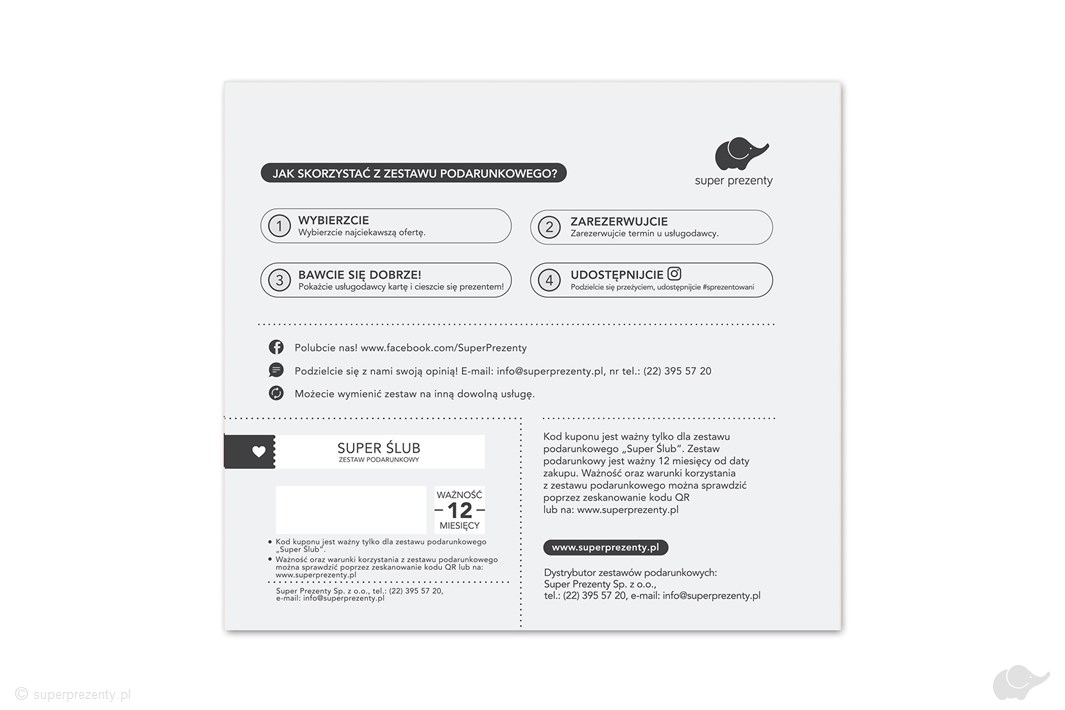 Pięknemu wydarzeniu, jakim jest ślub, powinny towarzyszyć piękne przeżycia. Z tą właśnie myślą powstał zestaw Super Ślub. Wierzymy, że ilość i różnorodność znajdujących się w nim przeżyć, jest równie barwna, jak charaktery i temperamenty – przyszłych, świeżo upieczonych i celebrujących kolejne rocznice par.