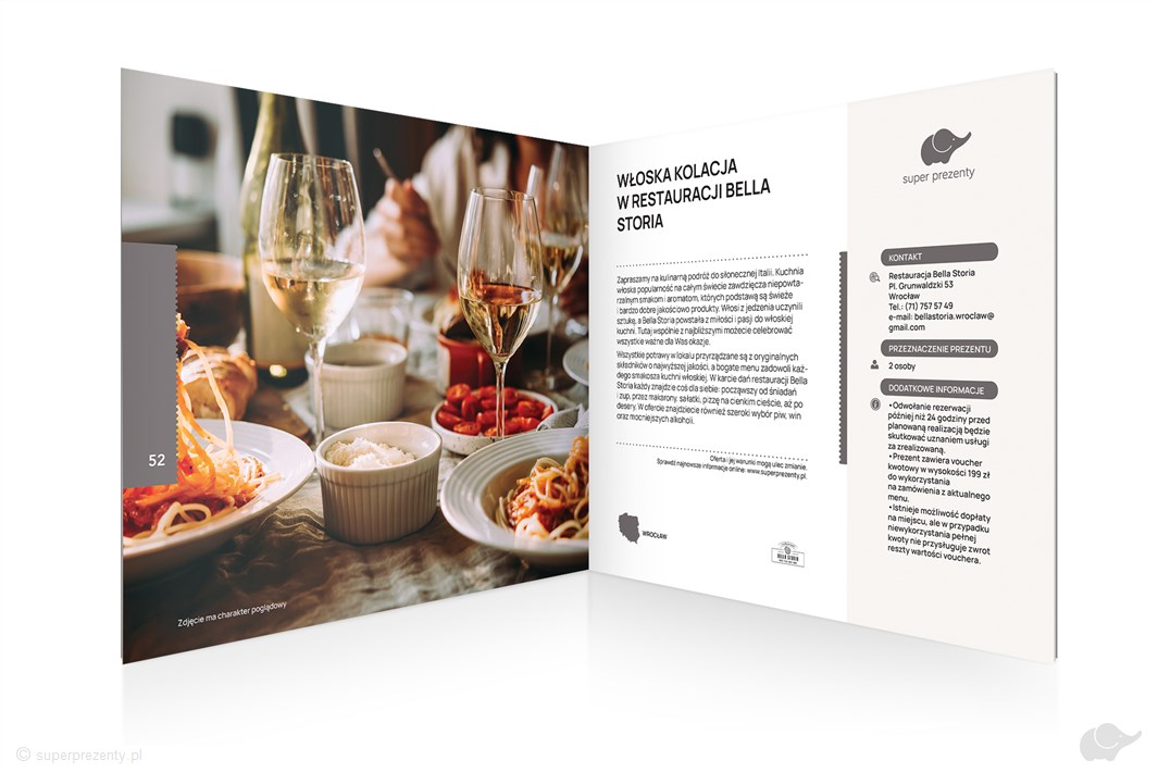 W zestawie podarunkowym Super Wrocław nie mogło zabraknąć propozycji dla miłośników dobrej kuchni – tę znajdą oni w menu restauracji: Art i Bella Storia. Amatorów przygód ugości kraina wygasłych wulkanów – niewiele osób wie, że wiele milionów lat temu na terenie Polski istniały aktywne wulkany! Upominki w formie przygód to także trening personalny oraz psychologia z coachingiem i mentoringiem – idealne dla osoby interesującej się ideą samorozwoju.