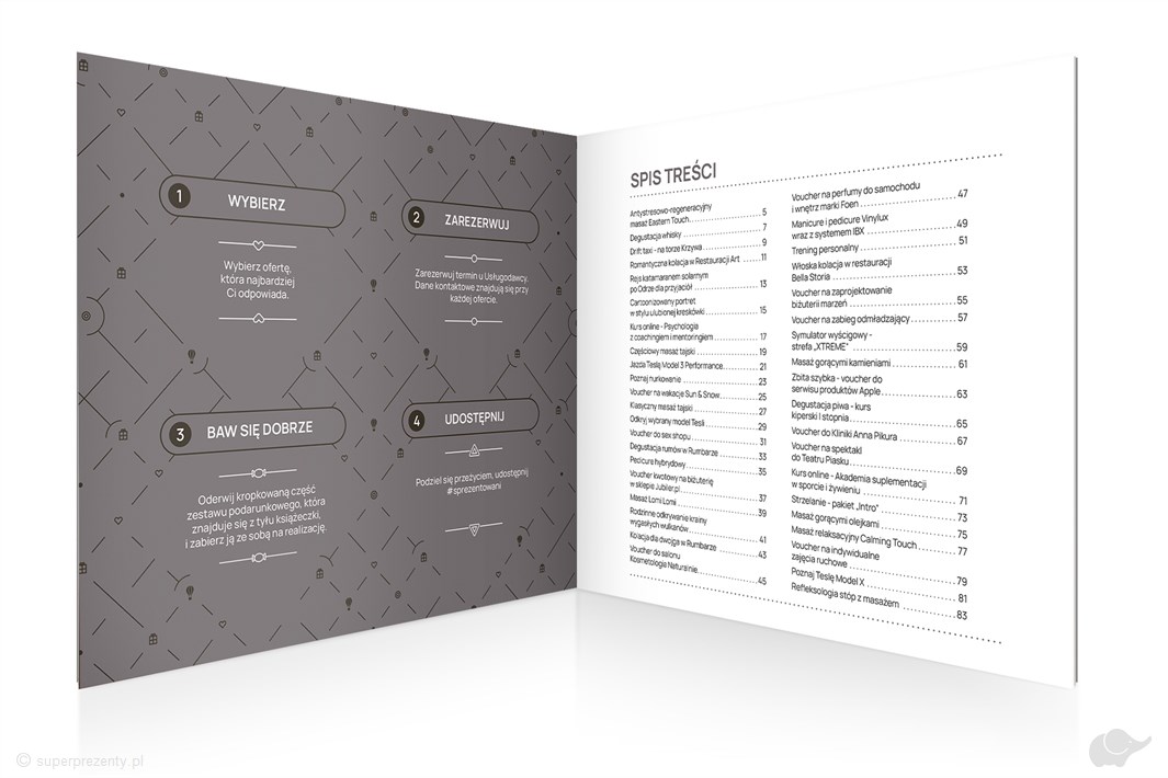 Już nie musisz główkować, jaki można kupić voucher na prezent! Zestaw podarunkowy „Super Wrocław” daje pełną swobodę jego odbiorcy. Wśród przeżyć do wyboru znajdują się: nurkowanie, pływanie katamaranem, degustacje whisky, rumu, piwa, voucher na wakacje Sun & Snow lub biżuterię. Jeżeli bliska Ci osoba preferuje relaks – pakiet przeżyć Wrocław oferuje szeroki wybór relaksujących i upiększających doświadczeń w salonach spa!