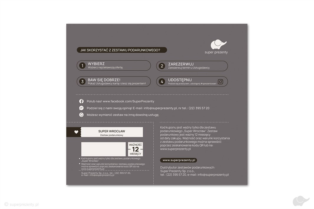 Osoba obdarowana wybierze jedno z przeżyć składających się na zestaw doświadczeń „Super Wrocław”. Każda z ofert zawiera opis przedstawiający szczegóły przeżycia, a ponadto informacje o rezerwacji i wymaganiach do realizacji.