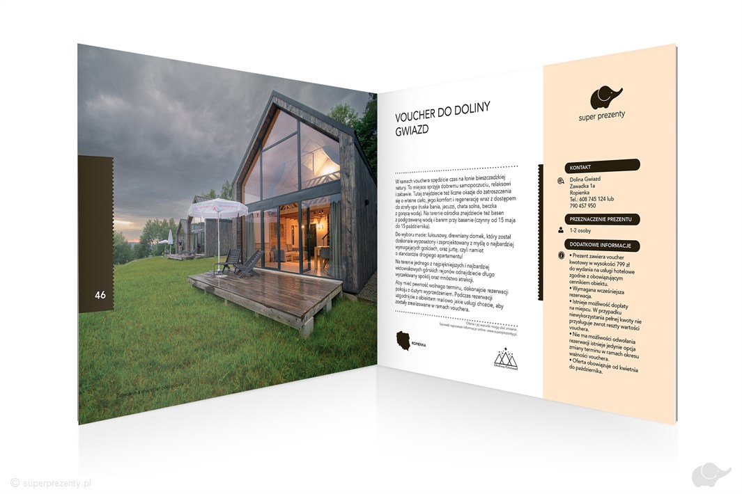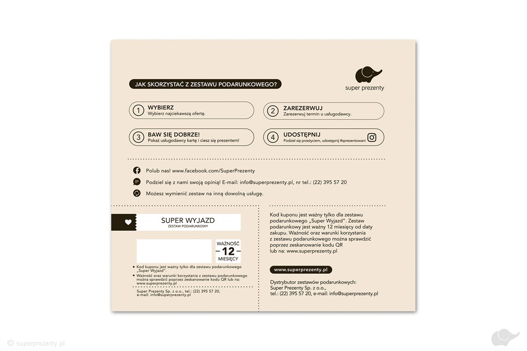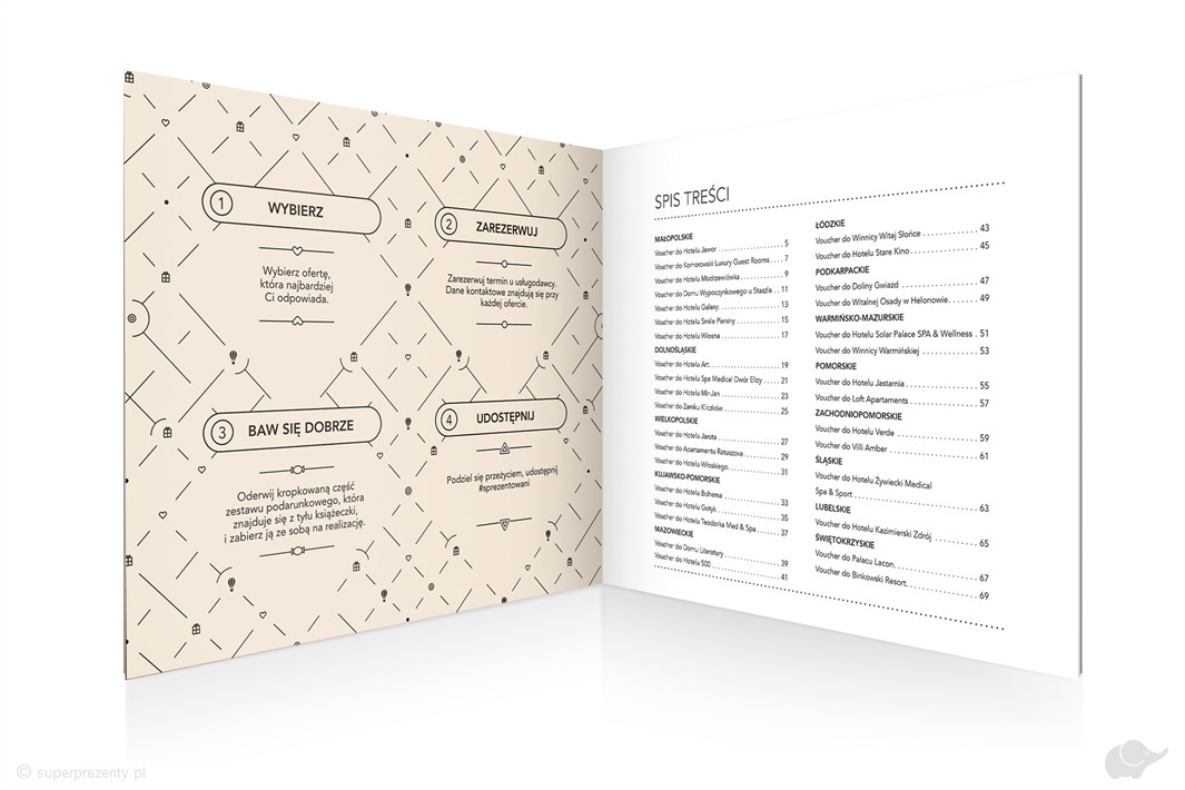 Osoba lub osoby obdarowane Zestawem Prezentowym Super Wyjazd wybiorą jedno z przeżyć zawartych w książeczce. Każda atrakcja zawiera dokładny opis oraz informacje o sposobie rezerwacji. Teraz wystarczy już tylko zarezerwować termin i cieszyć się wymarzonym wypoczynkiem!